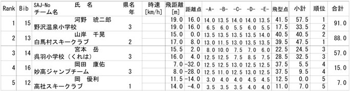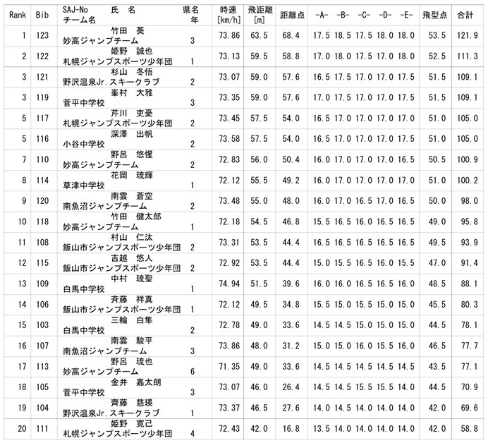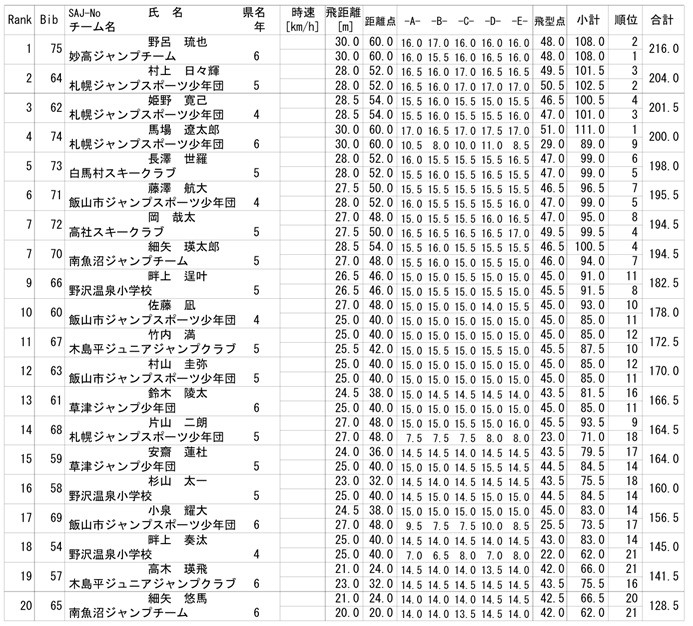 前列には、札ジャンのリウン選手、小谷のイズホ選手、菅平のタイガ選手、妙高のアオイ選手、野沢温泉のトウゴ選手。