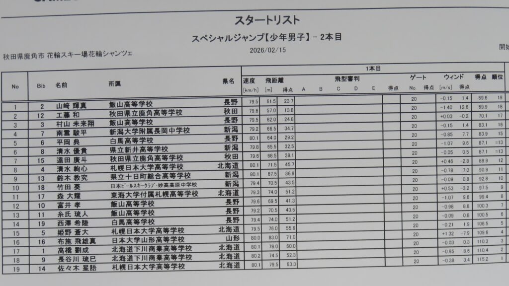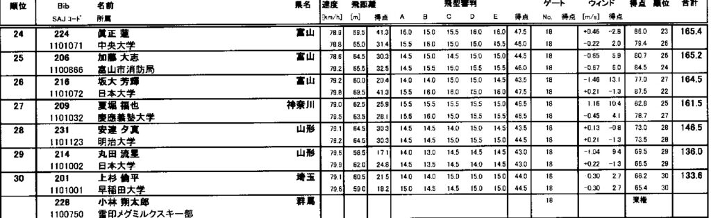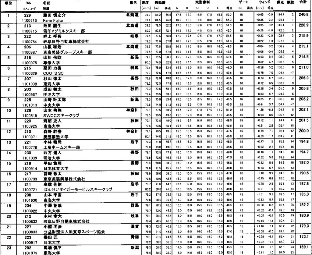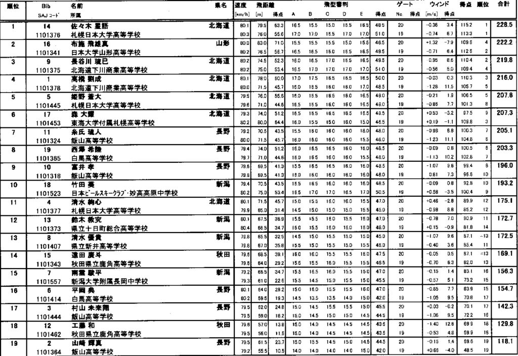 飛距離ではヒュウマ選手がトップでしたが、飛型点とウィンドファクターの加減で、