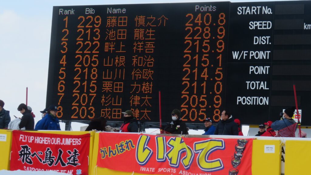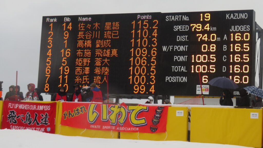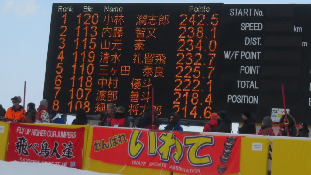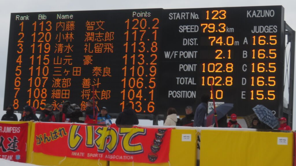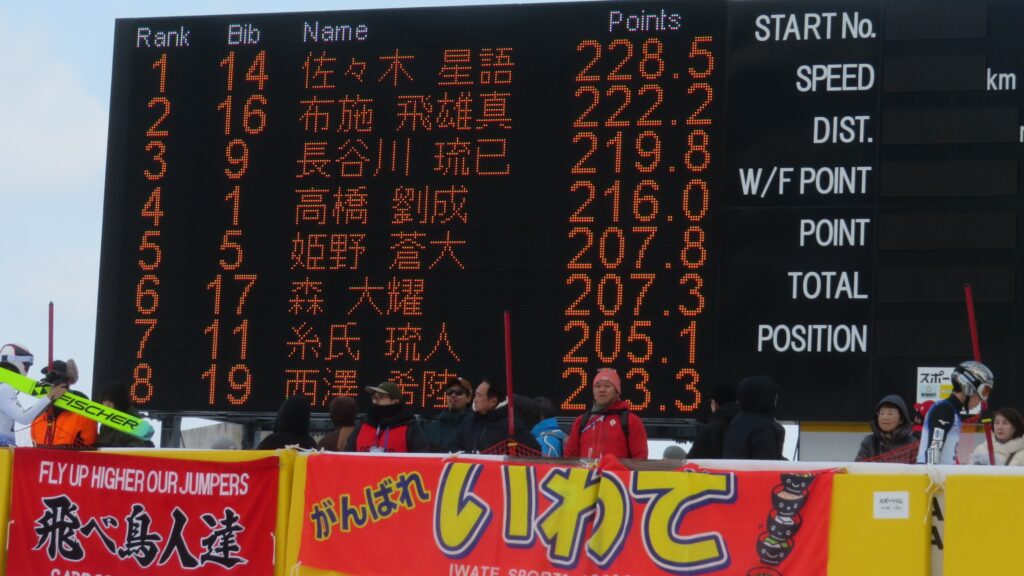 8位は、「PRESS」と書かれた赤いビブを付けた方々が電光掲示板の真ん前に立たれているため、私が居た所からでは選手名が読みにくくなってますが、コンバインドのユーヤ選手です。